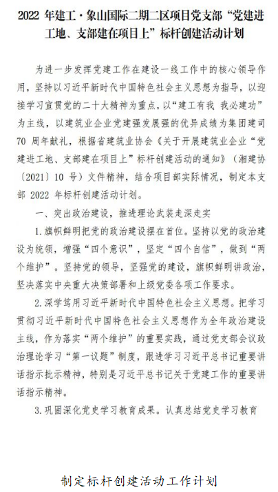 建工·象山国际二期二区项目党支部成立于2021年5月,是湖南建工集团有限公司打造基层党建示范“窗口”的具体行动和生动实践。目前有正式党员6人,其中支部班子成员2人,项目负责人担任支部书记。